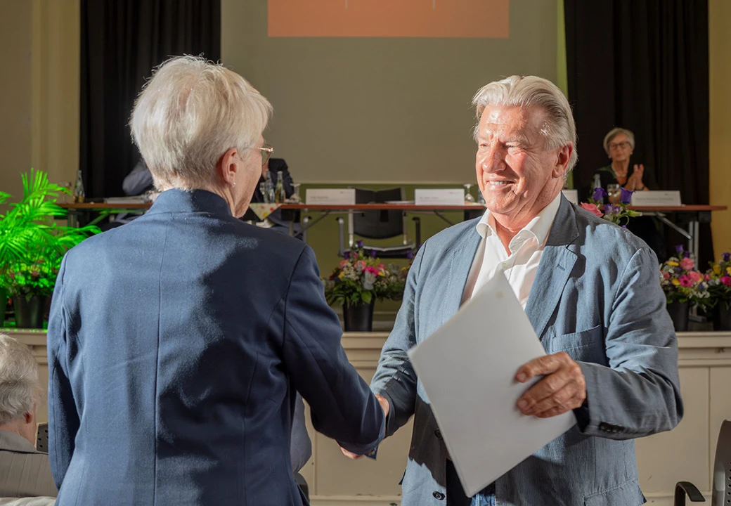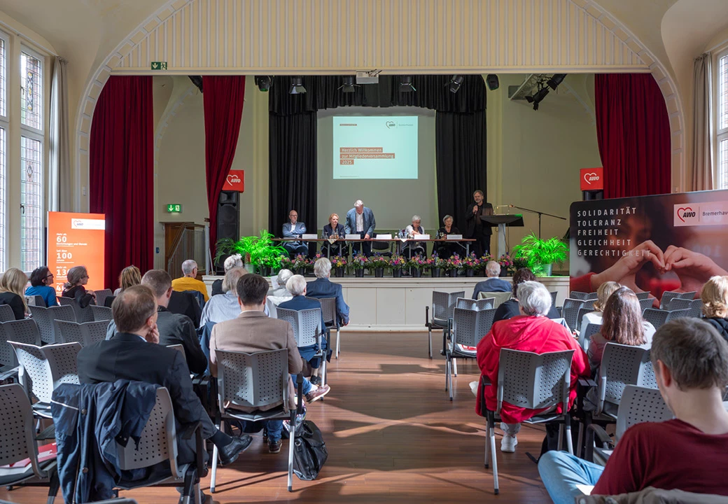 Herzlichen Beifall erhielt Anneliese Mehrtens, die für 40-jährige Mitgliedschaft geehrt wurde. Besonderer Gast der Mitgliederversammlung im Saal „Storm Deel“ der „Theo“ war Michael Groß, Vorsitzender des Präsidiums des AWO Bundesverbandes. Der Repräsentant von bundesweit 270.000 AWO‑Mitgliedern sowie 250.000 Mitarbeitenden und 70.000 Ehrenamtlichen in 18.000 Einrichtungen zeigte sich beeindruckt von den Angeboten in Bremerhaven und berichtete über aktuelle Gespräche des Wohlfahrtsverbandes mit der neuen Bundesregierung. Klare Forderung an die Koalition ist es, die Finanzierung sozialer Angebote zu stabilisieren.